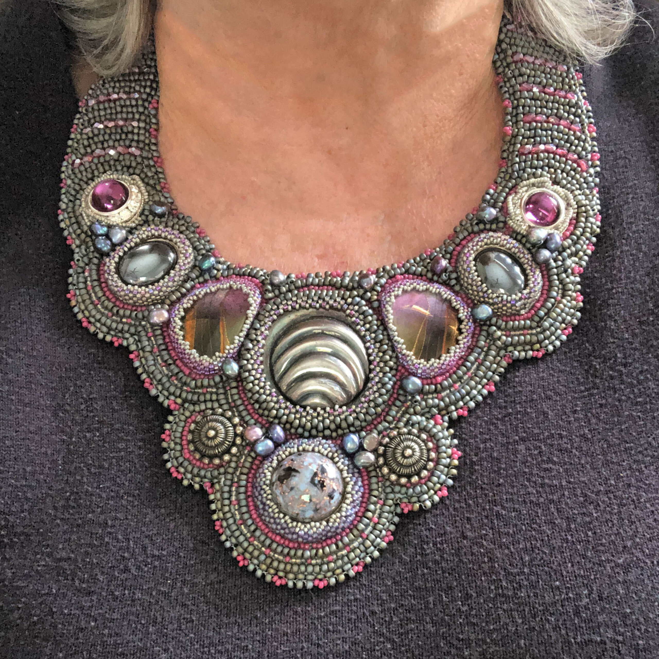 Evolution is in the air! I once owned a successful bead shop in Gahanna, Ohio; and in March of 2021 I retired to become a full-time bead and mixed media artist. This site is a place for me to showcase my work and to sell kits and tutorials. Additionally, I hope to sell finished jewelry in the near future. My work is crafted with originality and with care and I take pride in designing original, one-of-a-kind works of art and limited edition jewelry that you’ll be proud to own and wear. Currently, I sell my jewelry at Hayley Gallery in New Albany and Art at 43023 in Granville, both in Ohio. My mixed media shadow boxes are currently being shown at The Gallery on Gambier in Mount Vernon, Ohio.
